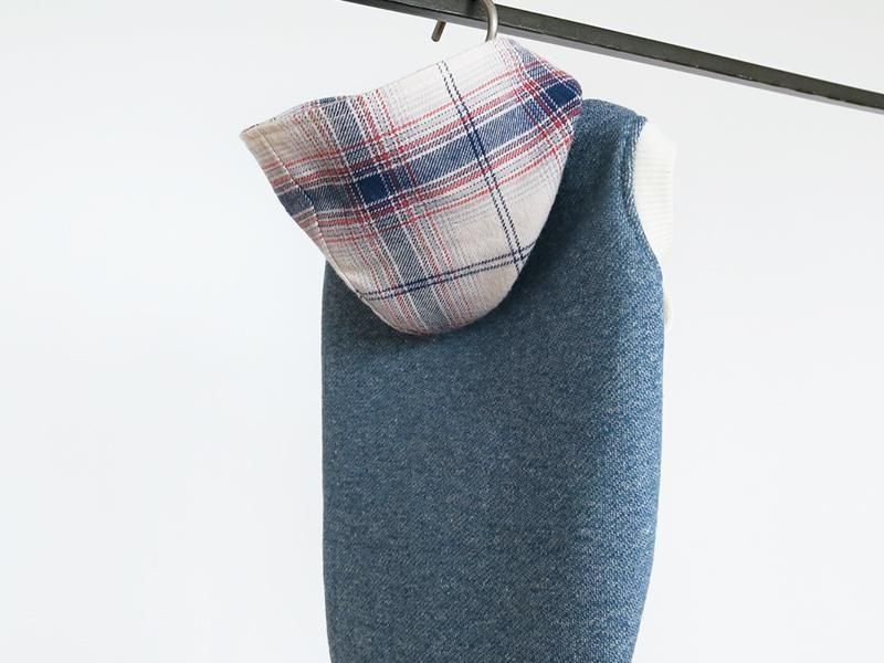 フード部分はふんわり起毛した、レッドやネイビーのお色のチェック柄となります。
