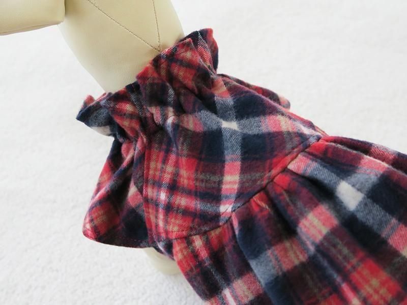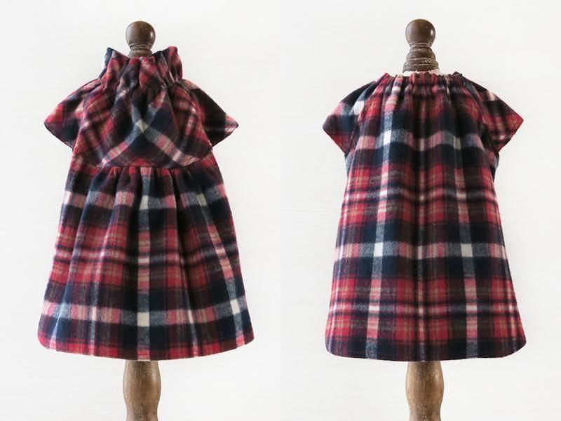 起毛チェック柄・レッドダークネイビー<フリルカラーお袖ひらひらわんぴ・スモック風わんぴ>
